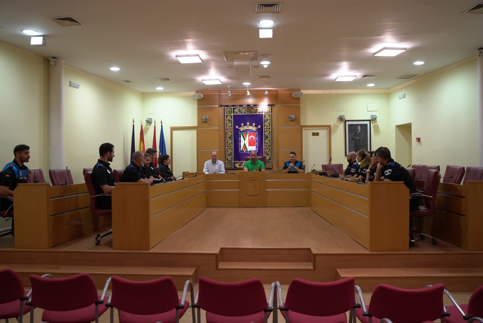 20-Junio-2022.- El alcalde de Colmenar Viejo, Jorge García Díaz, y el concejal de Seguridad Ciudadana, Jesús Fernández Fuillerat, han recibido esta mañana a los 12 nuevos Policías Locales del municipio que, tras seis meses en Instituto de Formación Integral en Seguridad y Emergencias (IFISE), comienzan hoy su trabajo en la localidad colmenareña.