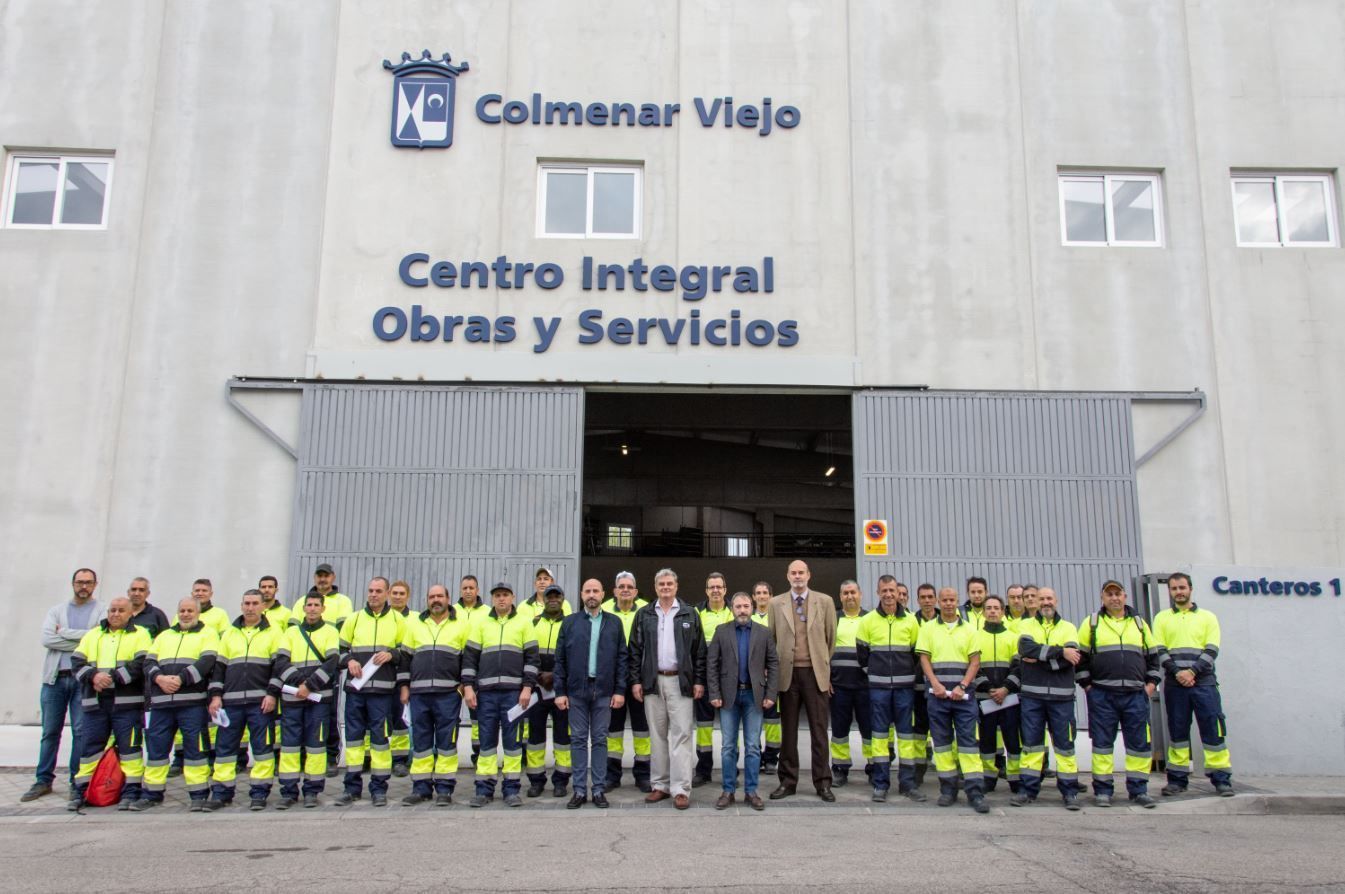 14-Octubre-2019.- El Alcalde de Colmenar Viejo, Jorge García Díaz, acompañado del Segundo Teniente de alcalde y concejal de Obras, Carlos Velasco y el concejal de Economía y Empleo, Agustín de la Fuente, han estado esta mañana en Centro Integral de Obras y Servicios con los 30 desempleados que están ocupados desde el 9 de octubre en el Ayuntamiento de Colmenar Viejo gracias al ‘Programa de Reactivación Profesional para personas desempleadas de larga duración mayores de 30 años’, cuyos contratos estarán financiados con cargo a los fondos recibidos del Servicio Público de Empleo Estatal distribuidos para su gestión por la Comunidad Autónoma de Madrid.