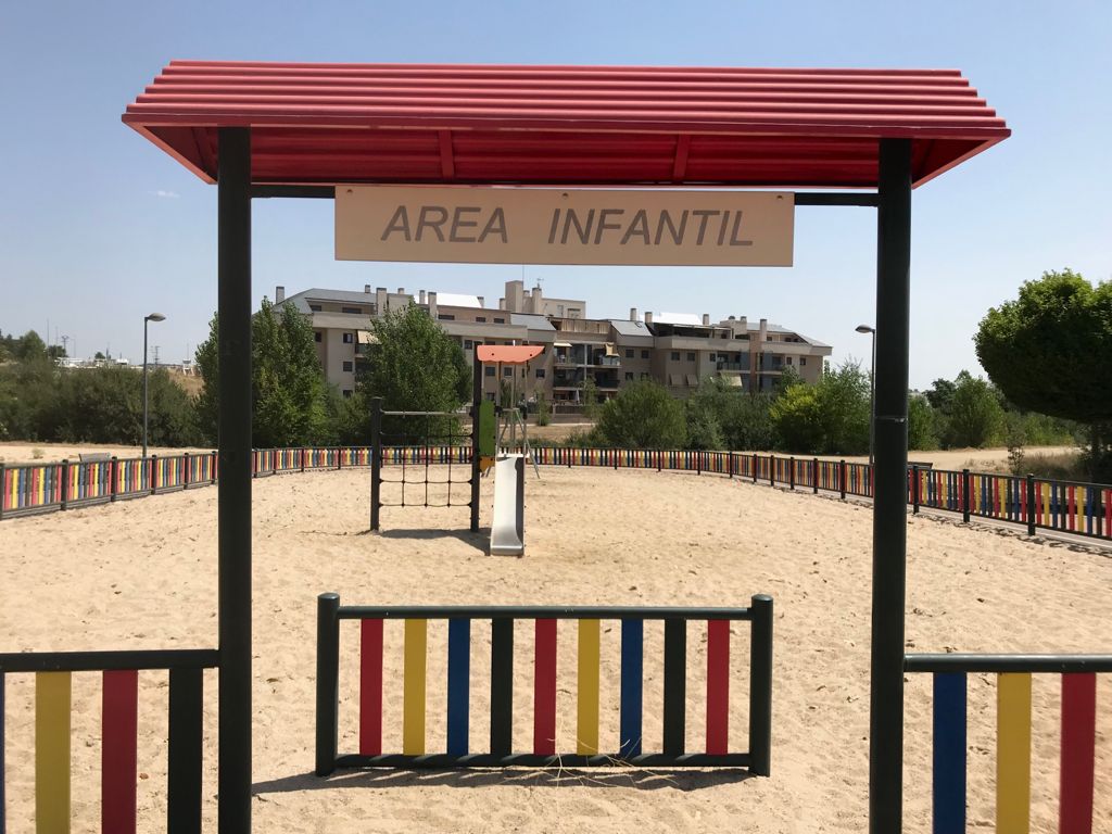 Se va a mejorar el área de juegos infantiles existente, introduciendo nuevos elementos de calidad, con variedad de juegos, alguno de ellos novedoso en el municipio y con carácter antivandálico. Primero se reubicará la combinación actual para ganar el mayor espacio posible, para después instalar el nuevo elemento principal compuesto por una gran combinación de juegos de estructura metálica formada por tres plataformas situadas a más de 1,30 m de altura, que incluirá, entre otros elementos, toboganes rectos, tubo de bomberos o muro de trepa. También se instalará una rueda giratoria a modo de juego para correr, dos muelles balancines con figura de animal y una casita de juegos con tejado a dos aguas con trepa. Ambos lados del acceso al parque se ornamentarán con pradera de césped artificial tricolor, sobre los que se instalará nuevos bancos de fibra de vidrio.
