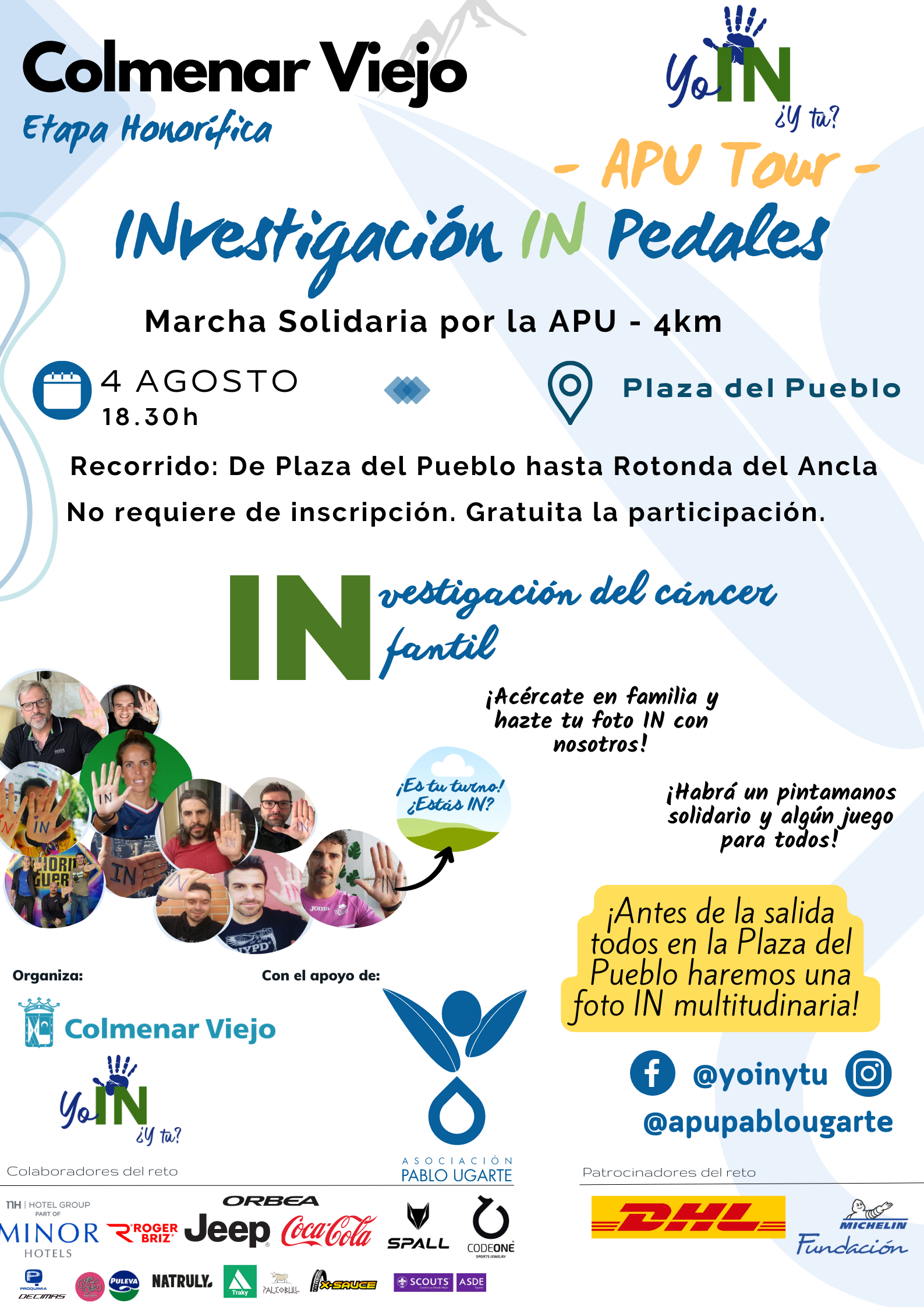 02-Agosto-2023.- La Asociación Pablo Ugarte, ‘Yo IN ¿y tu?’ y el Ayuntamiento de Colmenar Viejo, organizan una marcha solidaria de 4 kilómetros por la APU y la investigación del Cáncer Infantill, el próximo viernes 4 de agosto a las 18.30h. desde la Plaza del Pueblo.