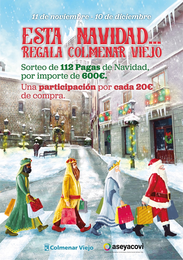 11-noviembre-2024. El Ayuntamiento de Colmenar Viejo y la Asociación de Empresarios, Comerciantes y Autónomos de Colmenar Viejo (ASEYACOVI) han puesto en marcha la campaña ‘Pagas de Navidad’, que tiene como objetivo el incentivar las compras en la temporada navideña mediante un sorteo en el que los vecinos, a través de sus compras en los comercios participantes, pueden ganar una de las 112 pagas de 600 euros.