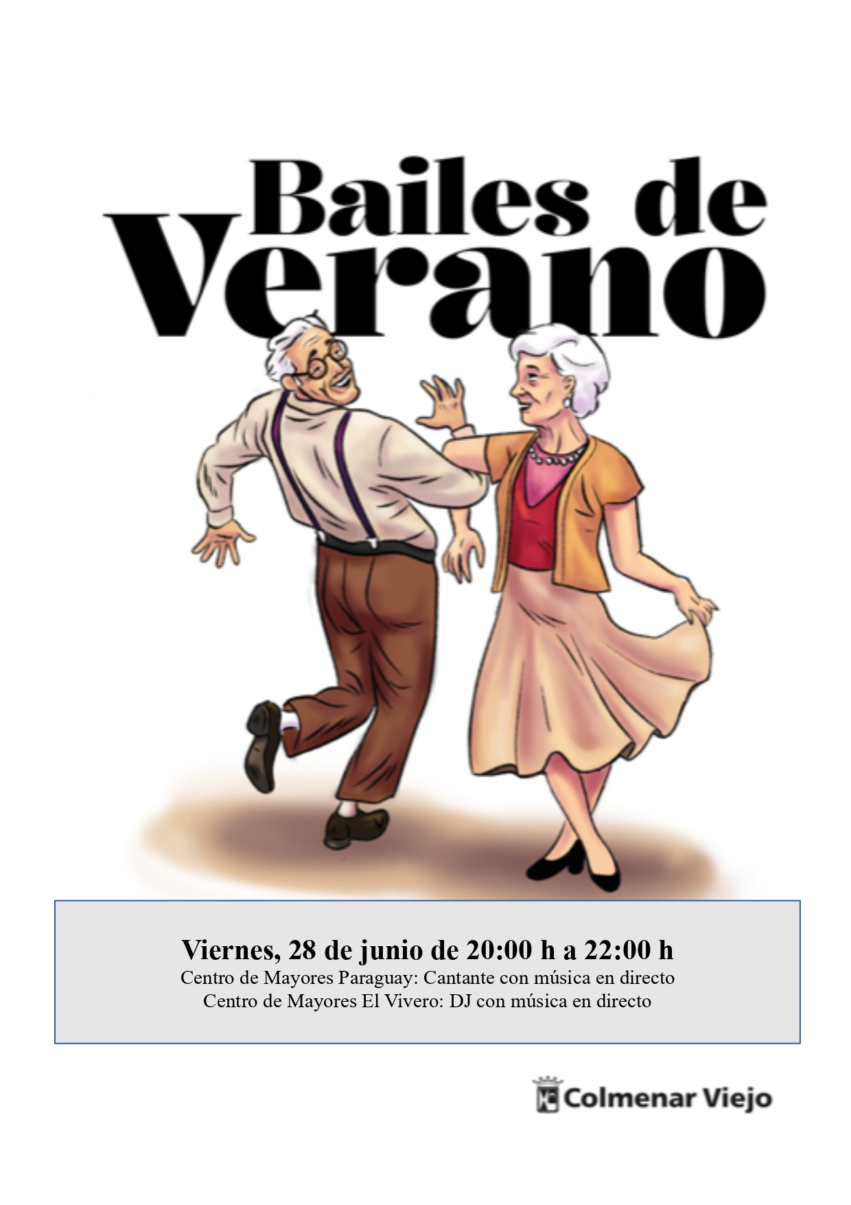 La Concejalía de Familia, Mayores, Juventud e Infancia ha preparado para este verano bailes en los diferentes Centros de Mayores de Colmenar Viejo. Estos tendrán lugar las noches de viernes y sábados entre el 28 de junio y el 17 de agosto, de 20:00 a 22:00h.