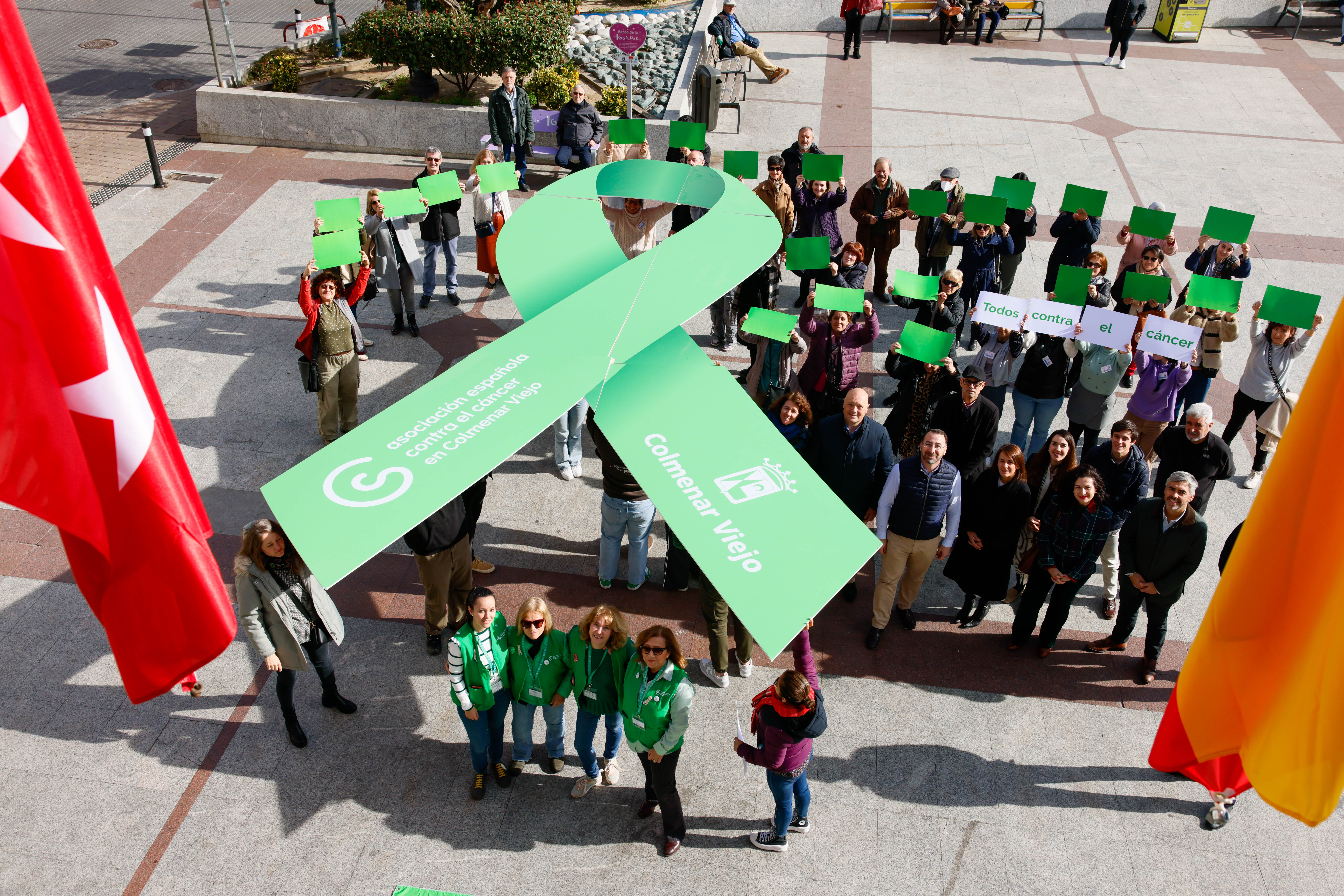 06-Febrero-2024.- El Ayuntamiento de Colmenar Viejo colabora con la Asociación Española Contra el Cáncer (AECC) para conmemorar el Día Mundial Contra el Cáncer con la lectura de un manifiesto, la formación de un gran lazo humano y otras iniciativas durante la mañana del martes en la Plaza del Pueblo.