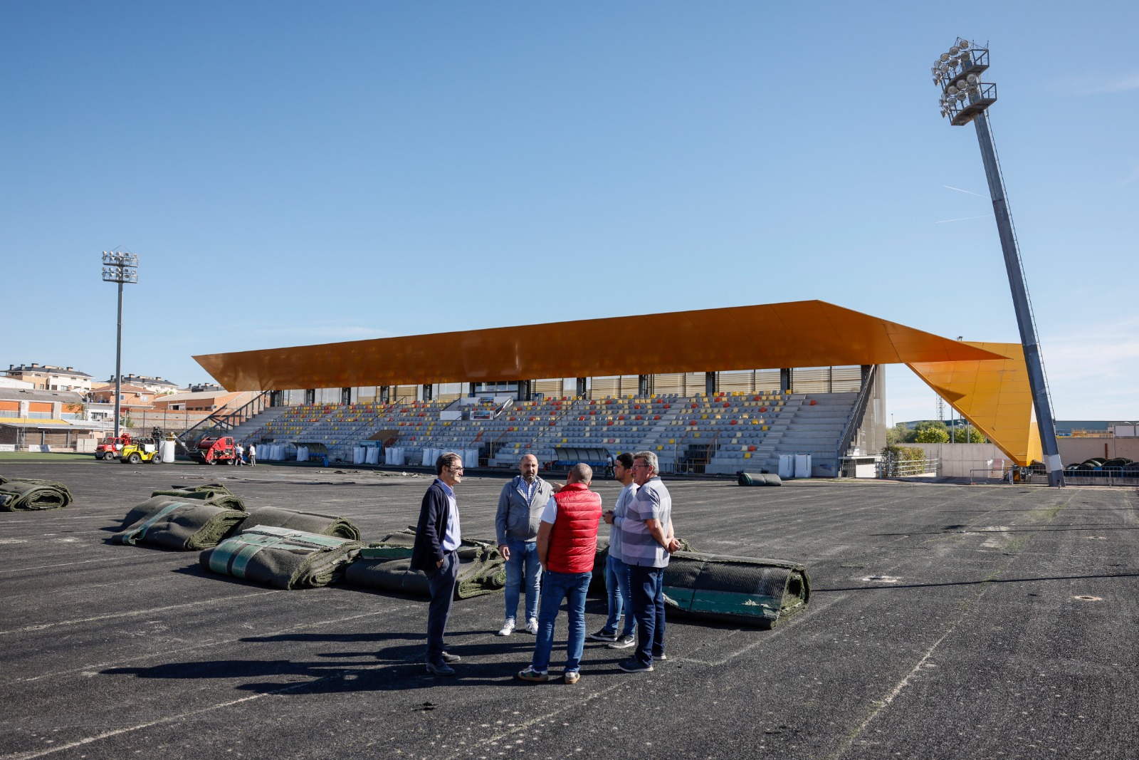 14-Octubre-2022.- El alcalde de Colmenar Viejo, Jorge García Díaz, y el concejal de Deporte, Jorge Domínguez Jiménez, han visitado el comienzo de obra de mejora del firme y cambio de césped artificial en los campos de fútbol Alberto Ruiz, que se adjudica en una segunda licitación por 539.055 euros tras quedar desierto hace unos meses el intento de contratación anterior por el alza de los precios de los materiales.