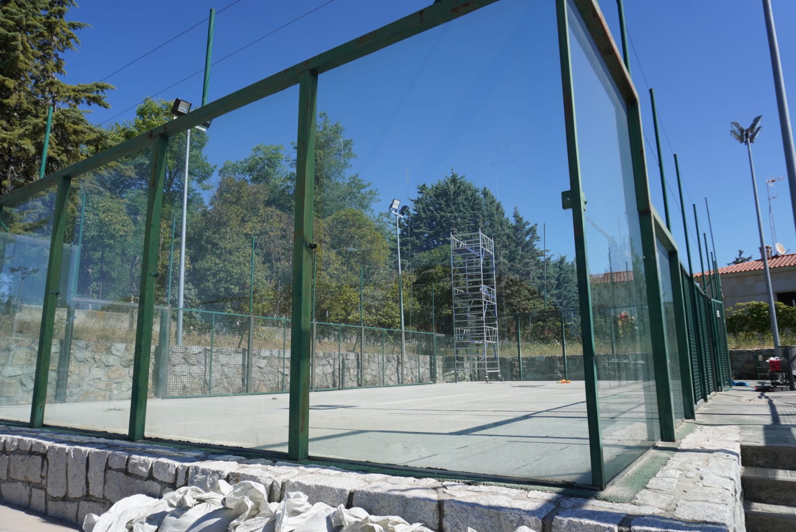 Esta adecuación consiste en la sustitución del anterior césped sintético deteriorado, por uno de última generación de monofilamento texturizado de polietileno de altura de 14 milímetros, una pista de color verde y la otra azul. Instalación de redes de protección de malla de nylon en la parte superior ubicadas a 3 metros de altura en los fondos y lateral, para evitar así la salida de las pelotas fuera de la instalación. Sumado a estas actuaciones, se renueva también el vallado perimetral, que pasa a ser de red metálica galvanizada en caliente y plastificada en color verde. Sobre los vidrios que conforman el cerramiento de la pista, se incluyen vinilos disuasorios para evitar el impacto de aves.