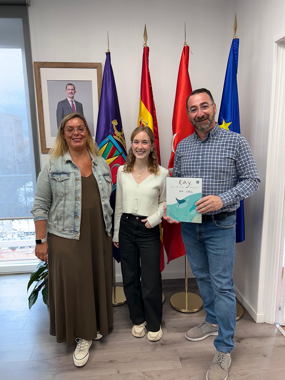 23-septiembre-2024. El alcalde de Colmenar Viejo, Carlos Blázquez Rodríguez, y la concejal de Cultura, Rocío Cámara Pellón, han recibido en el Ayuntamiento a la escritora colmenareña Iria Diz, quien les ha presentado el cuento ‘Ray, ¿qué son estas manchas?’, ilustrado por Lucía Valdés Arbolí y recientemente publicado por la editorial Babidi-Bú.