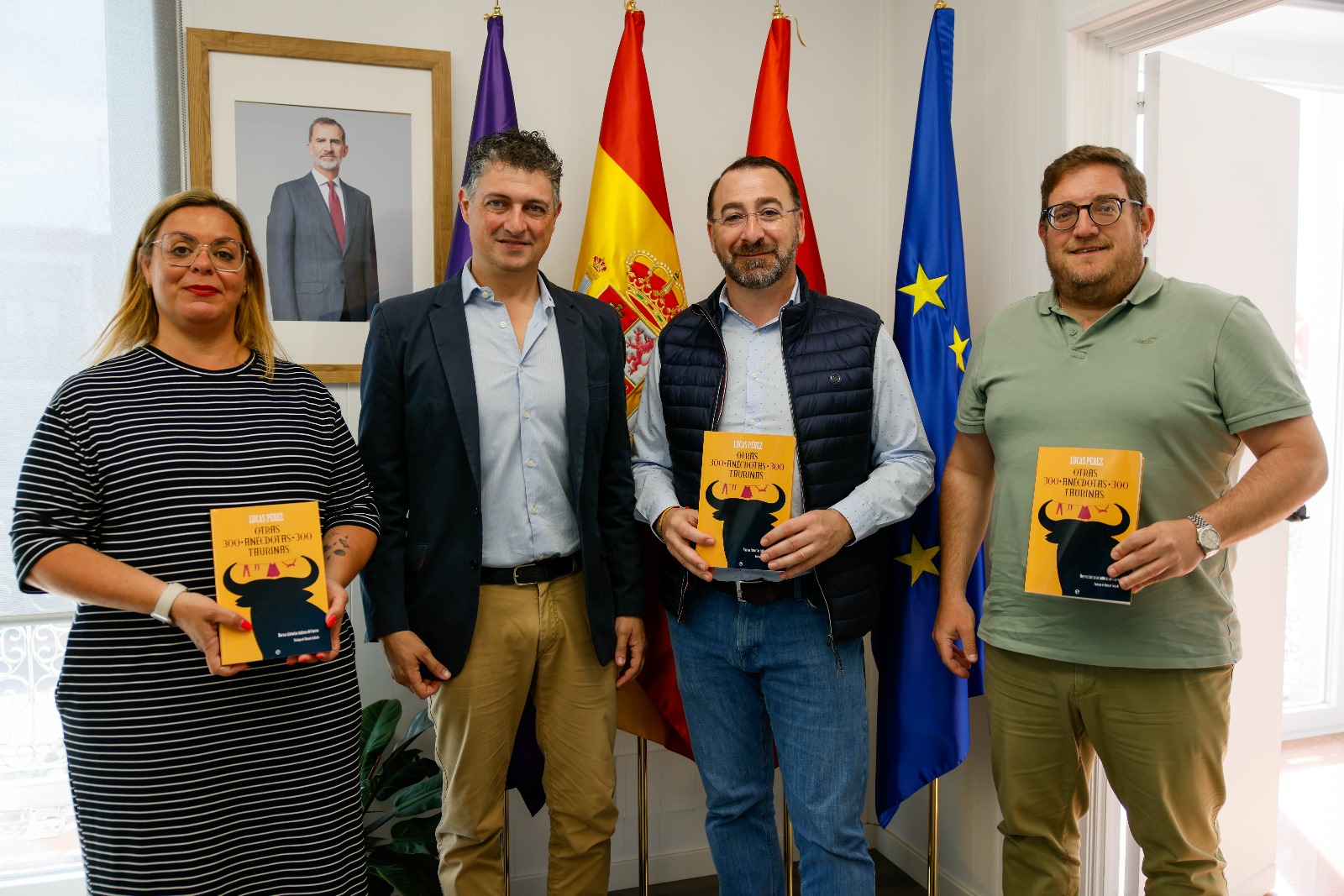 09-mayo-2024. El escritor colmenareño Lucas Pérez ha sido recibido este jueves en el Ayuntamiento por el alcalde de Colmenar Viejo, Carlos Blázquez Rodríguez, la cuarta teniente de alcalde y concejal de Cultura, Rocío Cámara Pellón, y el quinto teniente de alcalde y concejal de Asuntos Taurinos, Felipe Mansilla Nogales, para presentarles su nueva obra: ‘Otras 300 anécdotas taurinas’.