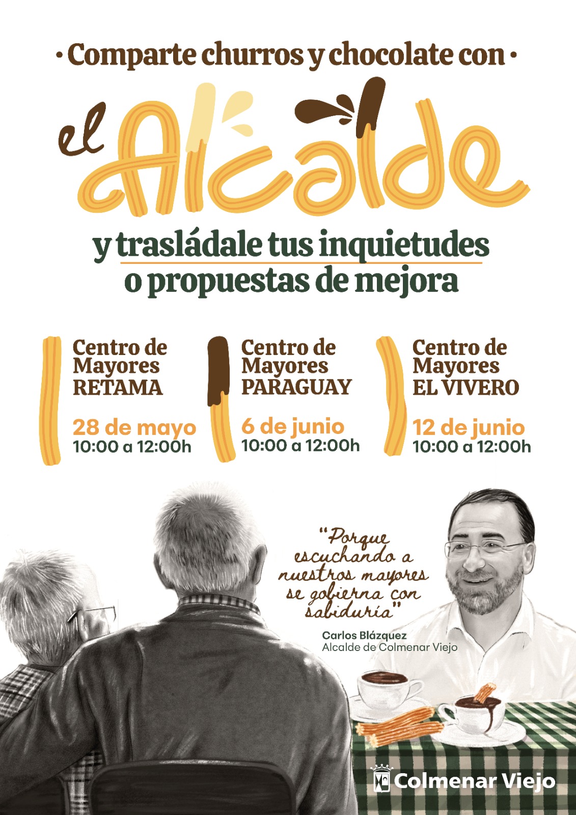 26-mayo-2025. El Ayuntamiento presenta una nueva iniciativa dirigida en esta ocasión a los mayores del municipio: ‘Comparte churros y chocolate con el Alcalde’. Carlos Blázquez compartirá un desayuno en los tres centros de mayores del municipio para que los usuarios le transmitan personalmente sus solicitudes.