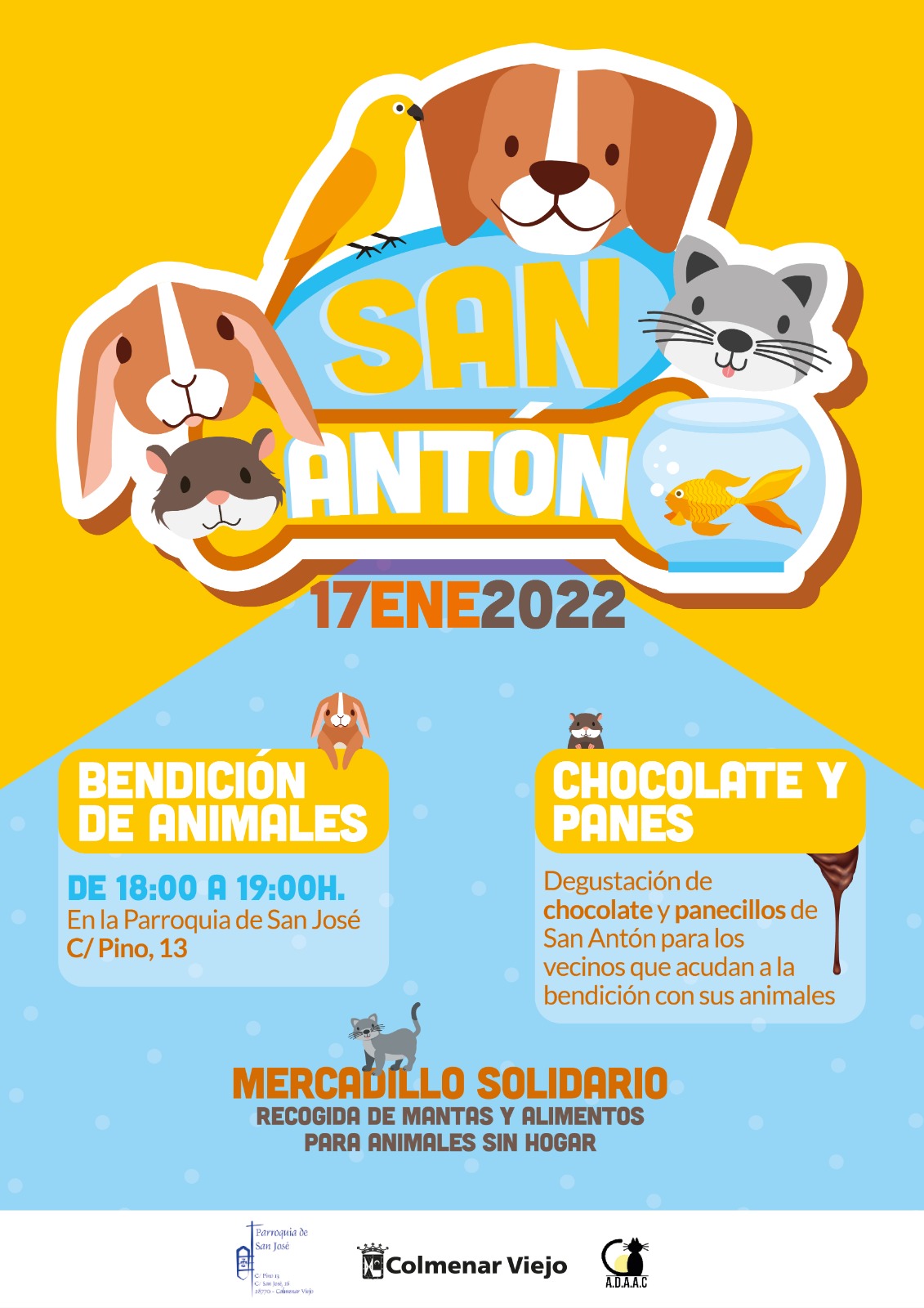Los vecinos que acudan a la bendición con sus animales podrán degustar el chocolate y los panecillos de San Antón que se repartirán junto a la Parroquia. Además, habrá un punto de información sobre la labor que desempeña ADAAC en defensa de los animales del municipio, mercadillo solidario, y recogida de mantas y alimentos para animales sin hogar.
