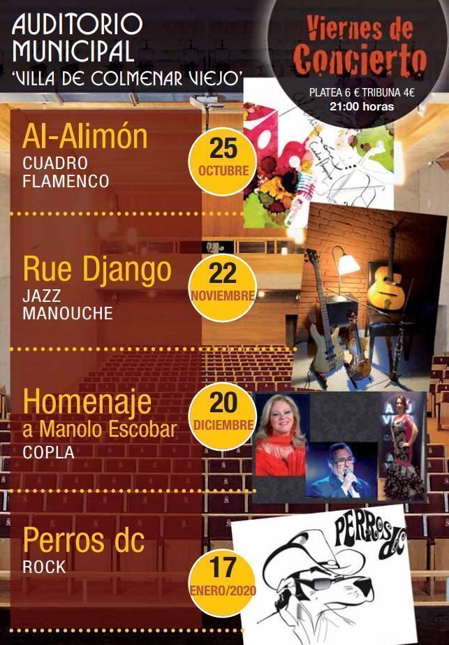 24-Octubre-2019.- El Auditorio Municipal Villa de Colmenar Viejo inaugura mañana la nueva temporada de “Los Viernes de Concierto”, completando la programación del Auditorio con una propuesta musical compuesta por conciertos de diferentes estilos musicales: flamenco, jazz, copla y rock.