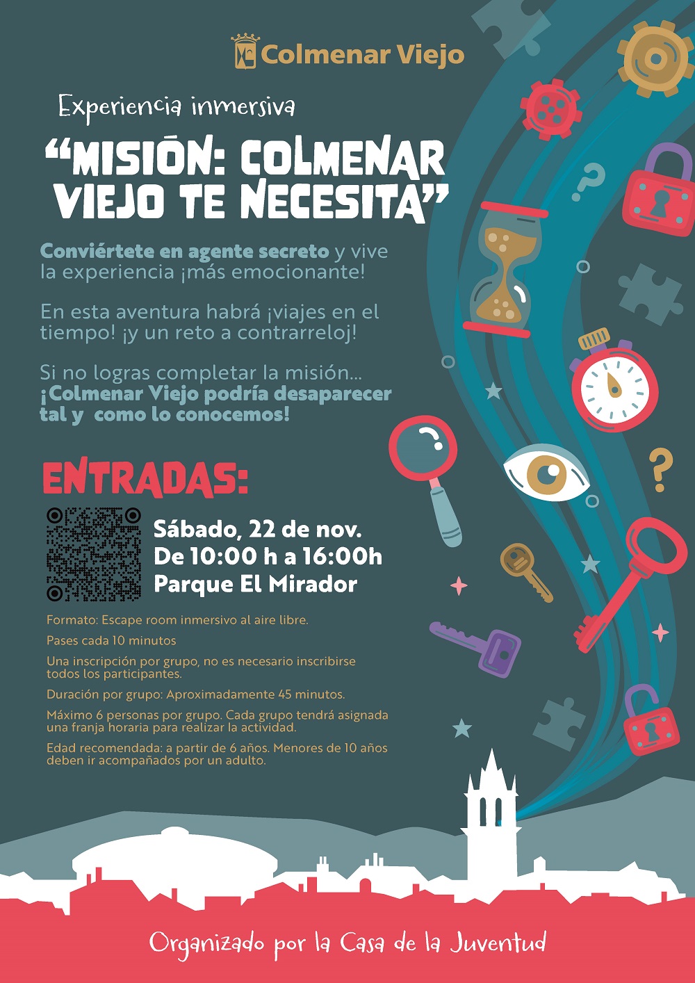 20-octubre-2025. Con motivo del Día de Colmenar Viejo, La Casa de la Juventud ha programado para el sábado 22 de noviembre un escape room inmersivo al aire libre: ‘Misión Colmenar Viejo te necesita’, que tendrá lugar en el Parque ‘El Mirador’, de 10:00 a 16:00h.