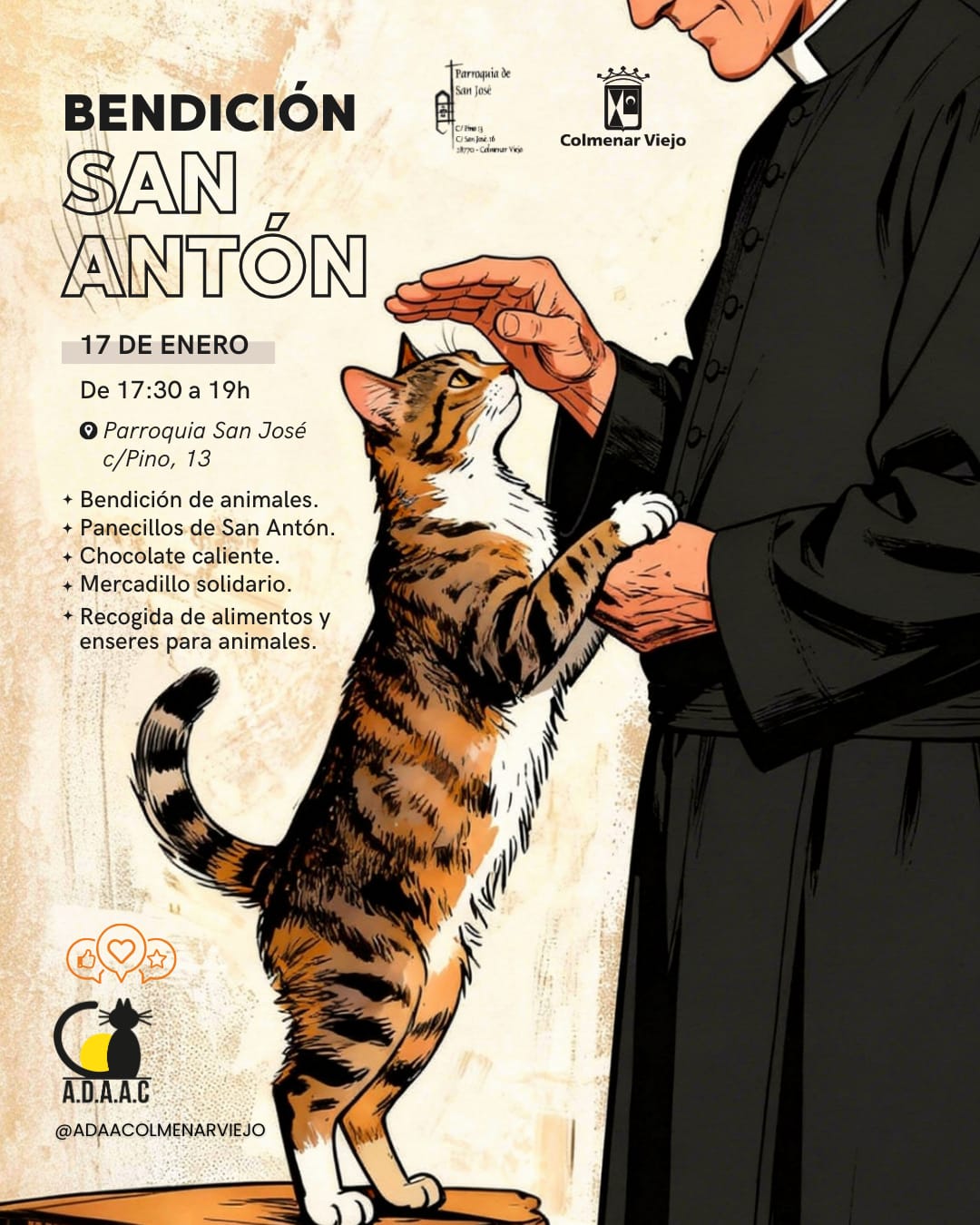 14-enero-2026. La Concejalía de Sanidad, en colaboración con la Parroquia de San José y la asociación ADAAC, invita a los vecinos de Colmenar Viejo a llevar a sus animales a la Parroquia de San José para recibir la tradicional bendición en el día de San Antón, patrón de los animales, el próximo sábado 17 de enero de 17:30 a 19:00h.