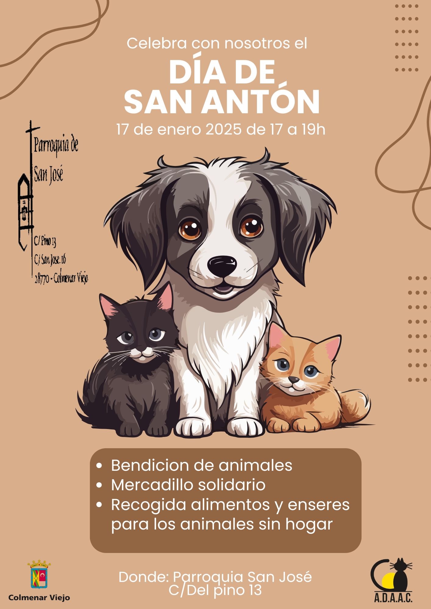 16-enero-2025. La Concejalía de Sanidad, en colaboración con la Parroquia de San José y la asociación ADAAC, invita a los vecinos de Colmenar Viejo a llevar a sus animales a la Parroquia de San José para recibir la tradicional bendición en el día de San Antón, patrón de los animales, el próximo viernes 17 de enero de 17:00 a 19:00h.