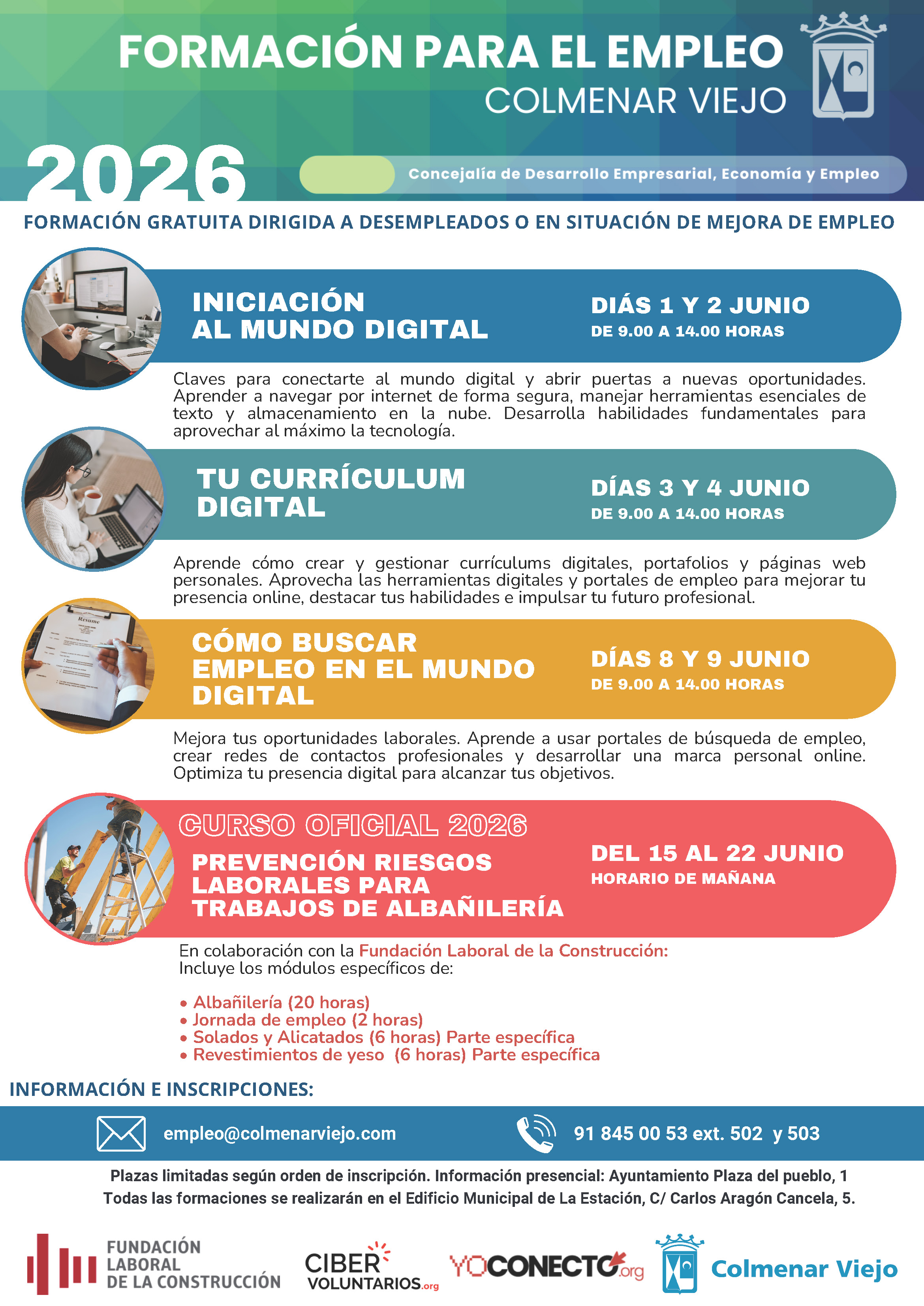 Para más información, enviar un correo electrónico a empleo@colmenarviejo.com, llamar al teléfono 918450053 (ext. 502 y 503) o de manera presencial en la sede de la Concejalía de Desarrollo Empresarial, Economía y Empleo (Ayuntamiento, Plaza del Pueblo, 1).