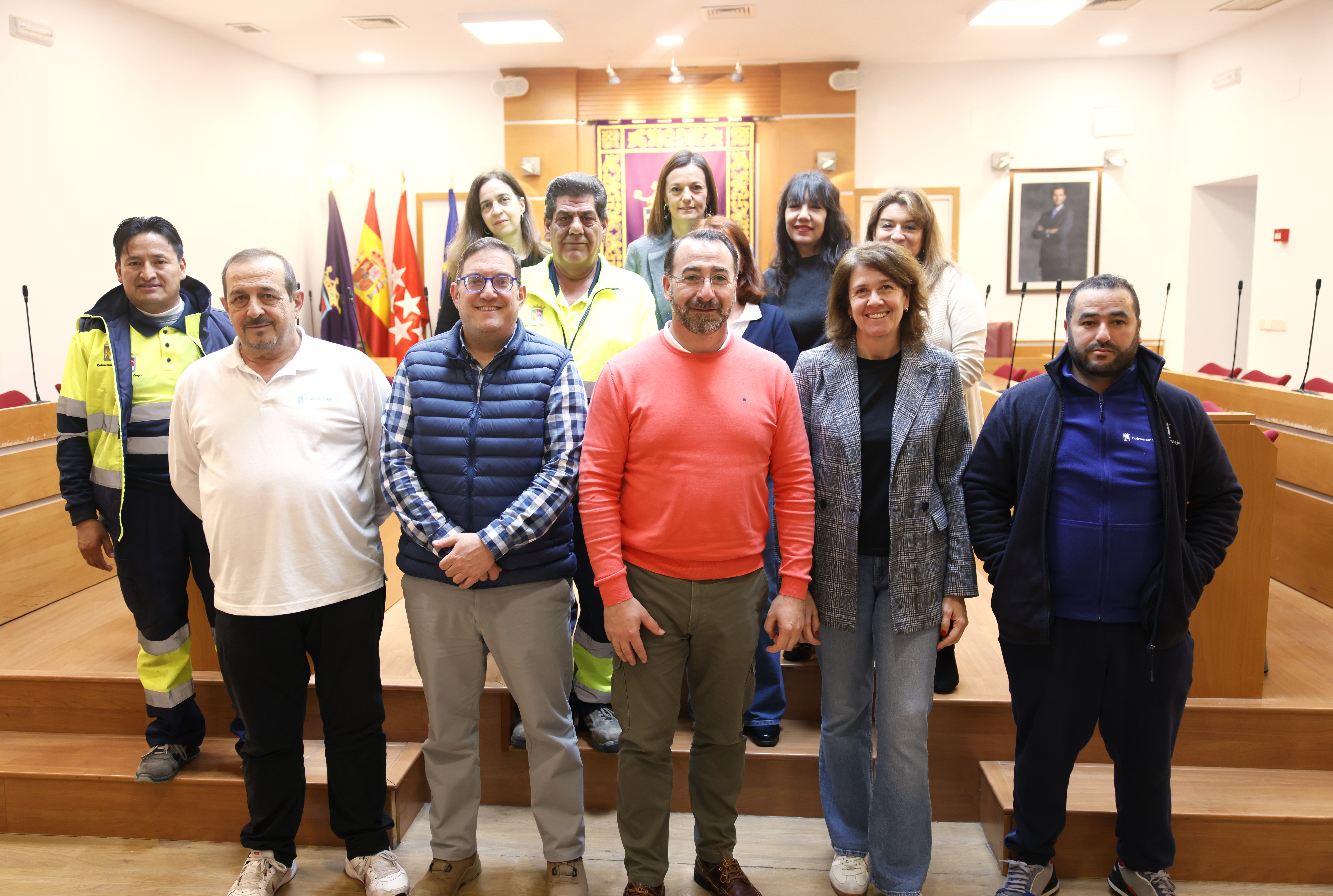 06-marzo-2026. El alcalde de Colmenar Viejo, Carlos Blázquez Rodríguez, y la tercera teniente de alcalde y concejal de Empleo, Susana Jiménez Aibar, han recibido en el Salón de Plenos del Ayuntamiento a los 22 profesionales que se incorporaron a la plantilla municipal a través del ‘Programa público de empleo-formación para la activación profesional 2025’, que ya se encuentra en su recta final. En la recepción también ha estado presente el quinto teniente de alcalde y concejal de Calidad y Mantenimiento de la Ciudad, Felipe Mansilla Nogales.