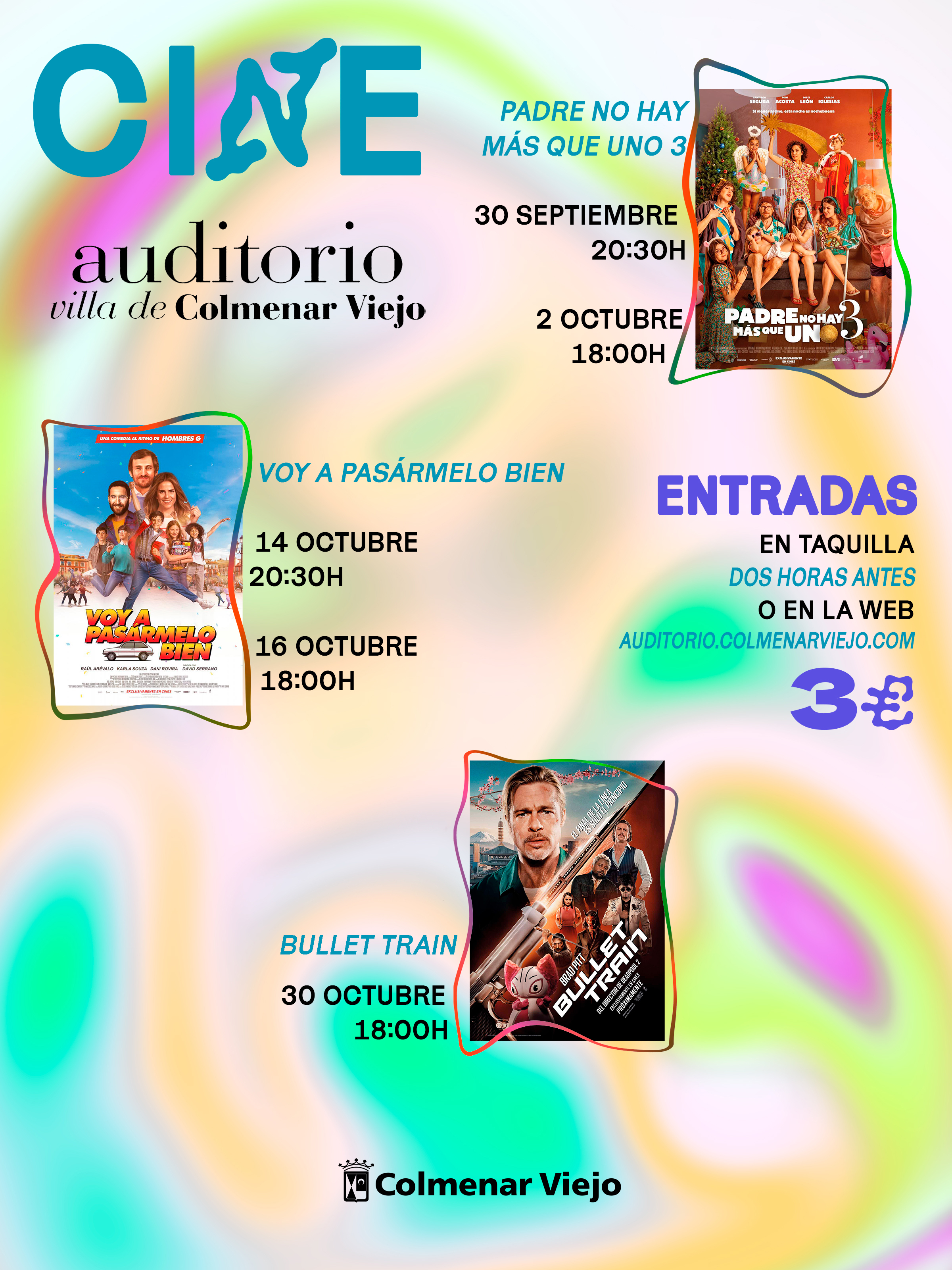 “Ya conocemos las películas que llegan al ‘Villa de Colmenar Viejo’ en su inicio de temporada, permitiéndonos disfrutar de los mejores títulos del año cada mes, sin salir del municipio y a un precio muy atractivo. Estas semanas llegan películas como la última entrega de la trilogía Padre no hay más que uno, una de las más taquilleras del país; bailaremos al son de Hombres G con la comedia Voy a pasármelo bien; y no faltarán las escenas de acción con el film Bullet Train”, añade la concejal de Cultura, Rocío Cámara Pellón.