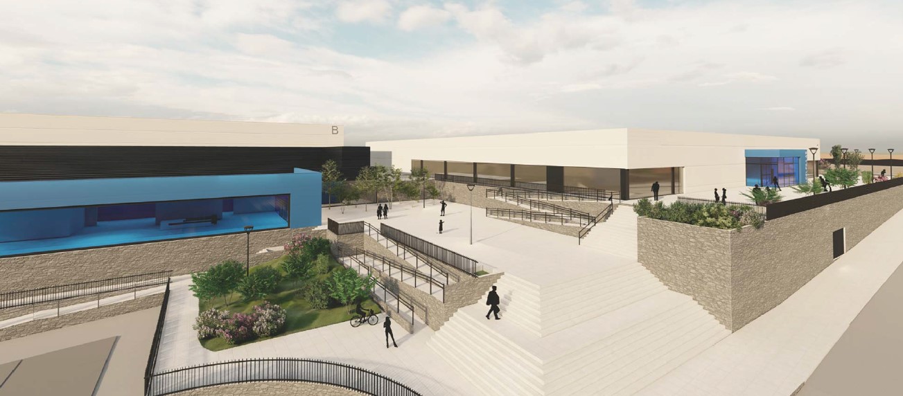 - Un pabellón deportivo dotado con piscina climatizada polivalente, vaso de enseñanza, sala de fitness, salas de actividades colectivas y vestuarios. En él se concentrará también la zona administrativa y se habilitará, además, un espacio de restauración con cafetería y restaurante.