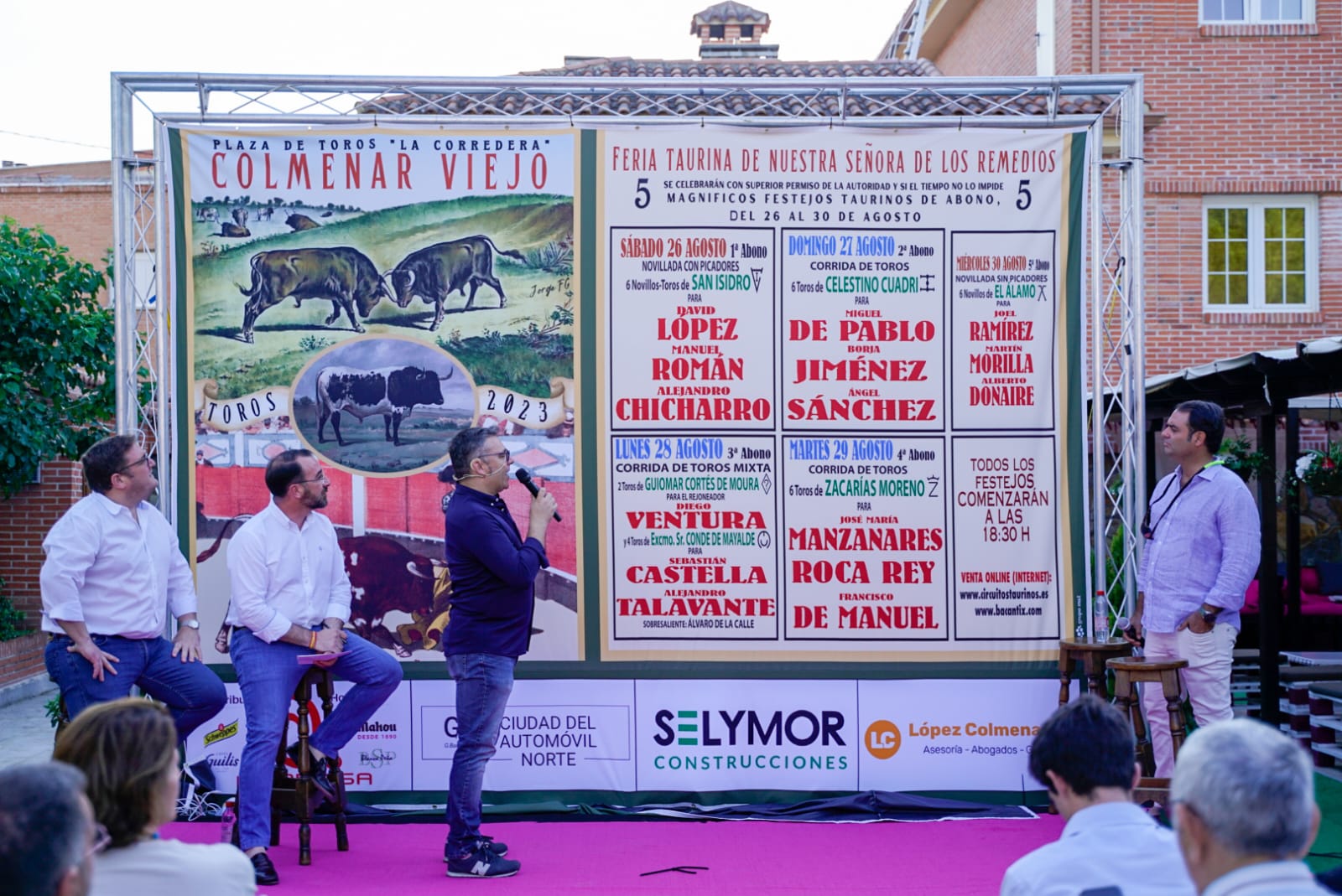 13-Julio-2023.- Ya se han presentado los carteles de la Feria Taurina de Nuestra Señora de los Remedios 2023 de la mano del alcalde de Colmenar Viejo, Carlos Blázquez Rodriguez, el concejal de Asuntos Taurinos, Felipe Mansilla Nogales y el responsable de Circuitos Taurinos (empresa concesionaria de la plaza), Carlos Zúñiga. El acto ha sido presentado por Marco Antonio Hierro de ‘Cultoro’ y de pregonero, el periodista del diario ‘El Mundo’ Gonzalo Izquierdo Bienvenida.