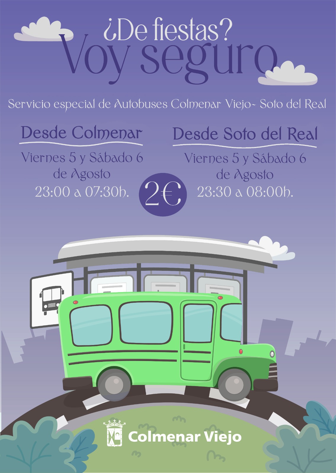 Bajo el lema “¿De Fiestas? Voy seguro” los autobuses saldrán de Colmenar Viejo a partir de las 23:00h. hasta las 07:30h., desde las paradas de Los Frailes y Los Arcos.