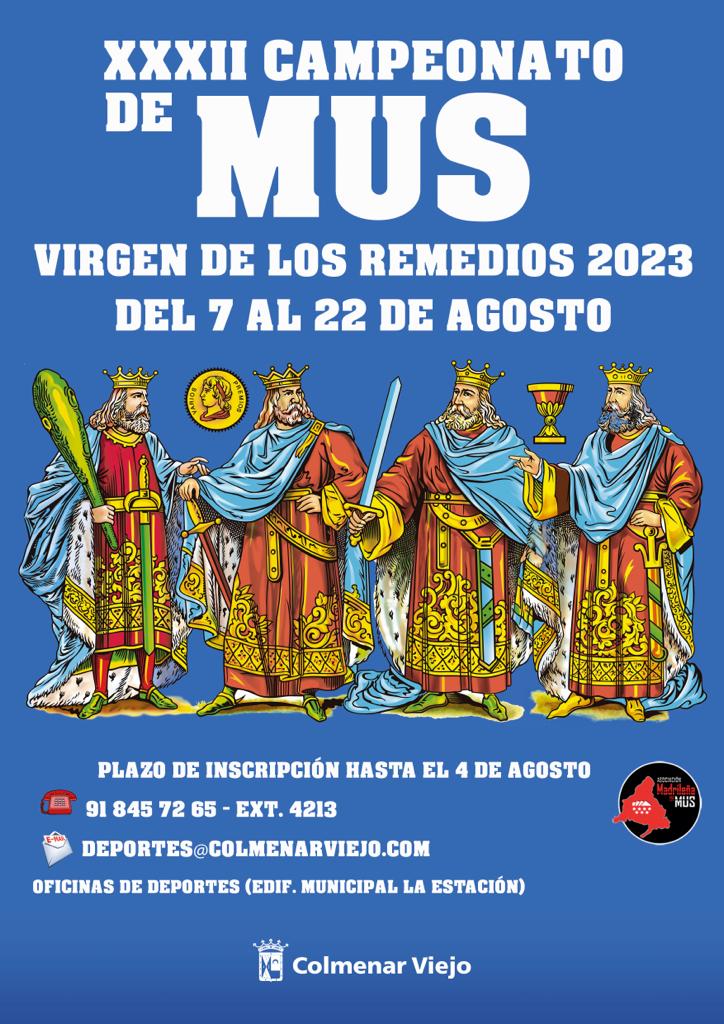 04-agosto-2023.- El Ayuntamiento recuerda que hoy, 4 de agosto, finaliza el plazo para apuntarse al Campeonato de Mus ‘Virgen de Remedios’, organizado por la Concejalía de Deportes en colaboración con la Asociación Madrileña de Mus. El torneo se desarrollará desde el 7 hasta el 22 de agosto a las 20:00h en la Plaza del Pueblo.